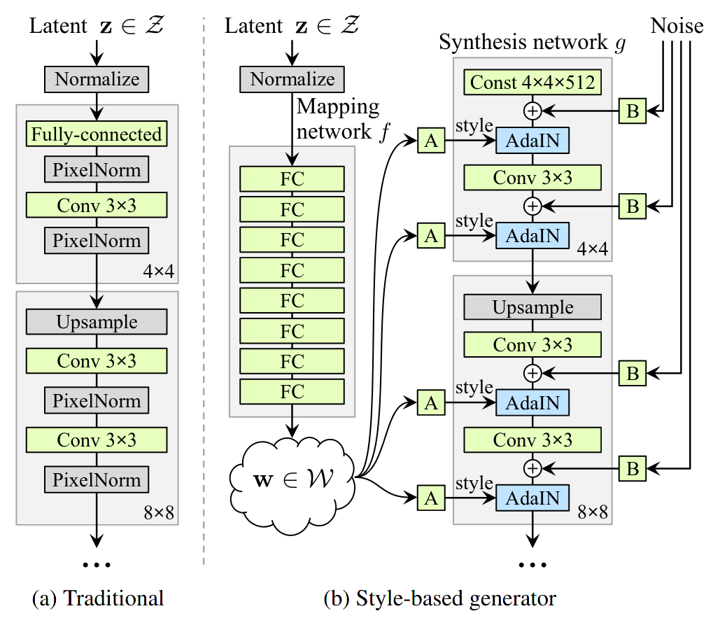 Figure 2 - Comparaison de l’architecture habituelle du générateur dans un GAN convolutif (à gauche) et de l’architecture du générateur dans StyleGAN [19].