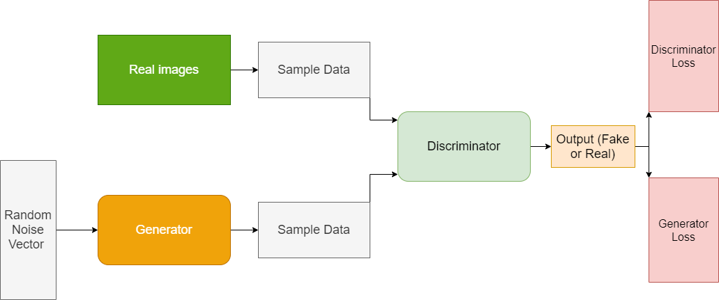 Un système de réseau antagoniste génératif (GAN) comprend deux réseaux neuronaux profonds : le réseau générateur et le réseau discriminateur. Comme nous l’avons vu, les deux réseaux s'entraînent dans un jeu contradictoire, où l'un essaie de générer de nouvelles données et l'autre tente de prédire si les résultats sont des données fausses ou réelles [1].